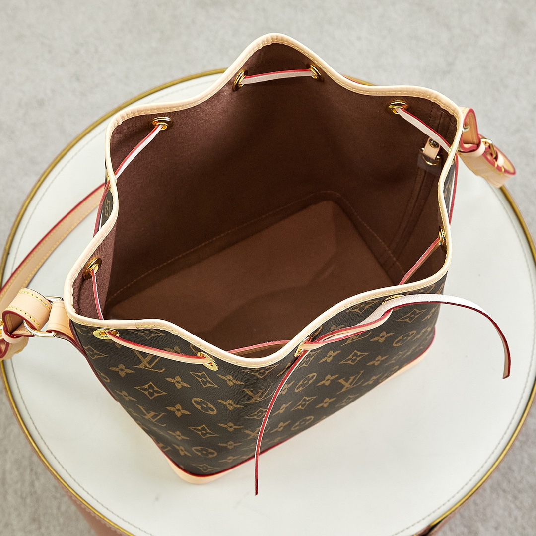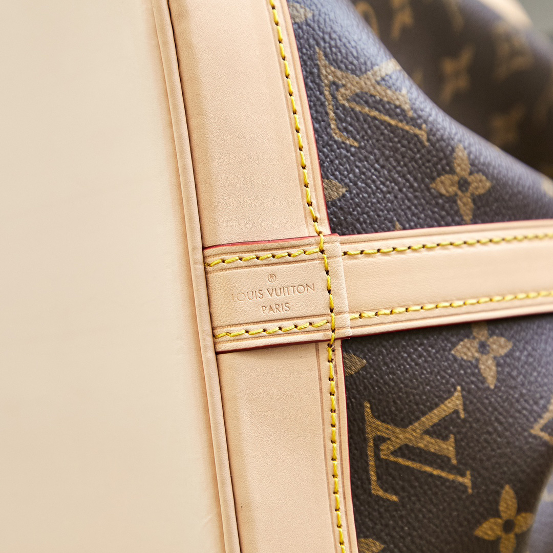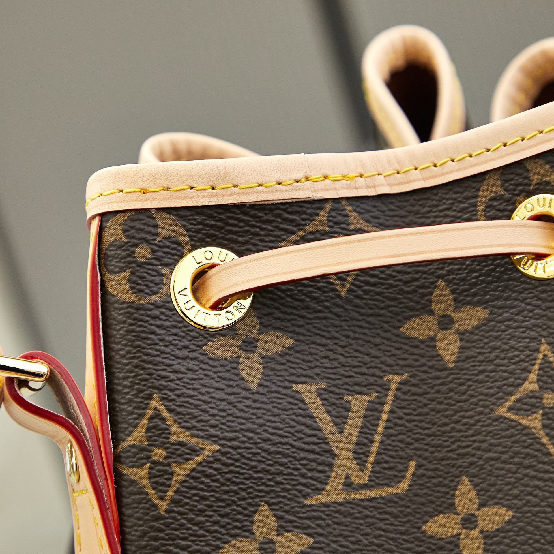 1932年にシャンパン収納用として誕生した歴史あるバケットバッグのコンパクト版。モノグラムキャンバスと天然牛皮革の組み合わせで、直径18x高さ21cmの丸みを帯びたシルエットが特徴。上部の皮革製引き紐で開閉し、内側にはDリング付き。容量約10Lで折り畳み傘やペットボトルも収納可能な実用性を備える。
