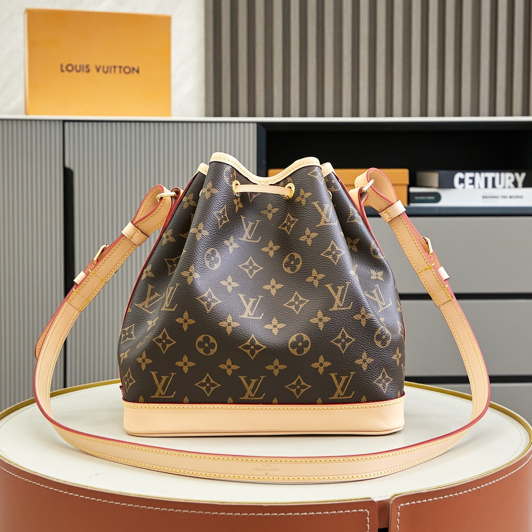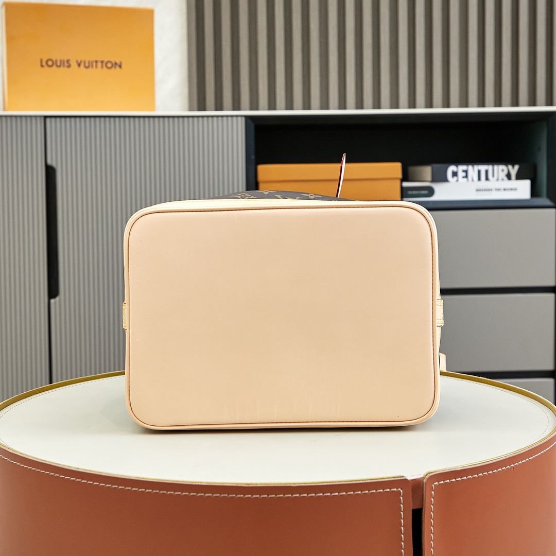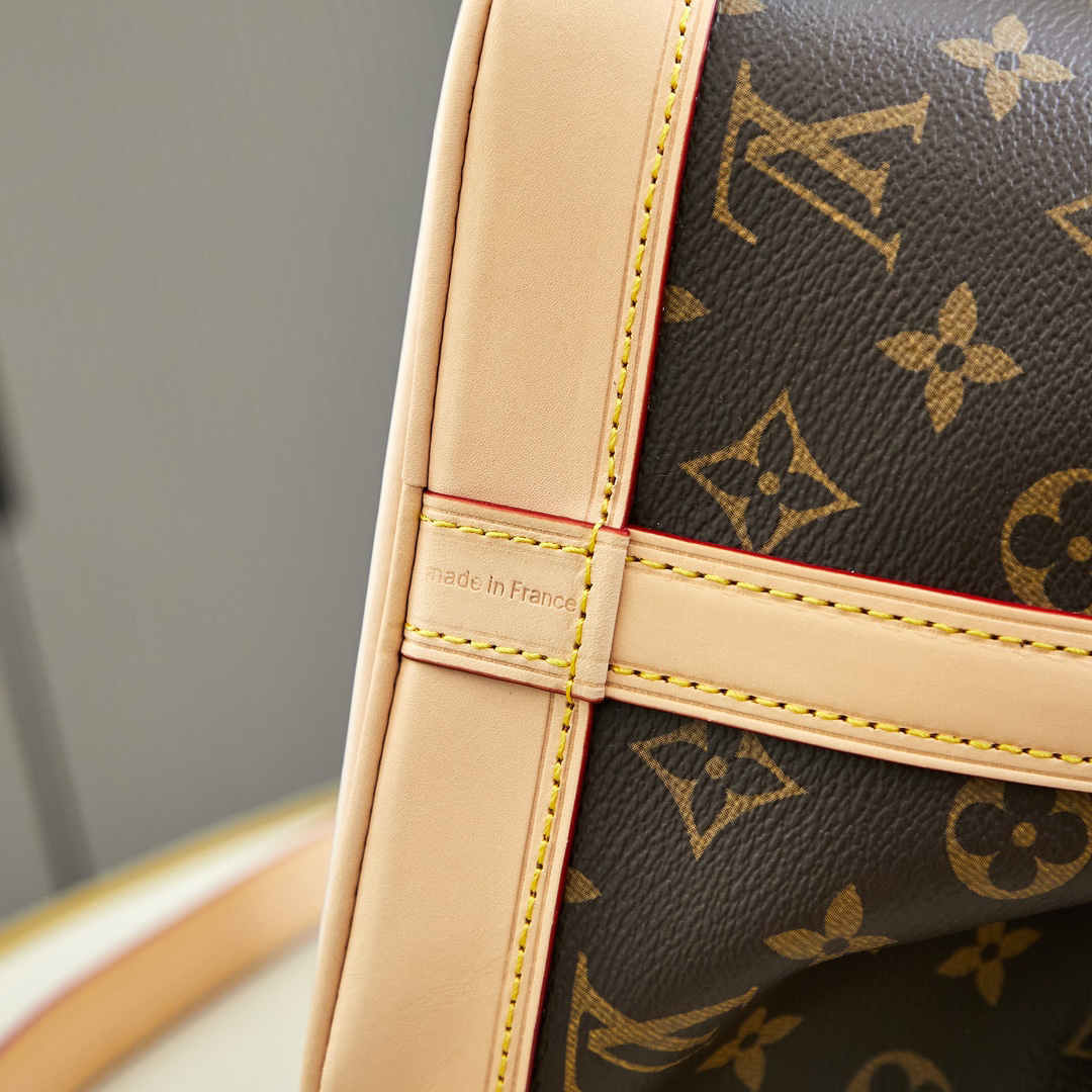 1932年にシャンパン収納用として誕生した歴史あるバケットバッグのコンパクト版。モノグラムキャンバスと天然牛皮革の組み合わせで、直径18x高さ21cmの丸みを帯びたシルエットが特徴。上部の皮革製引き紐で開閉し、内側にはDリング付き。容量約10Lで折り畳み傘やペットボトルも収納可能な実用性を備える。
