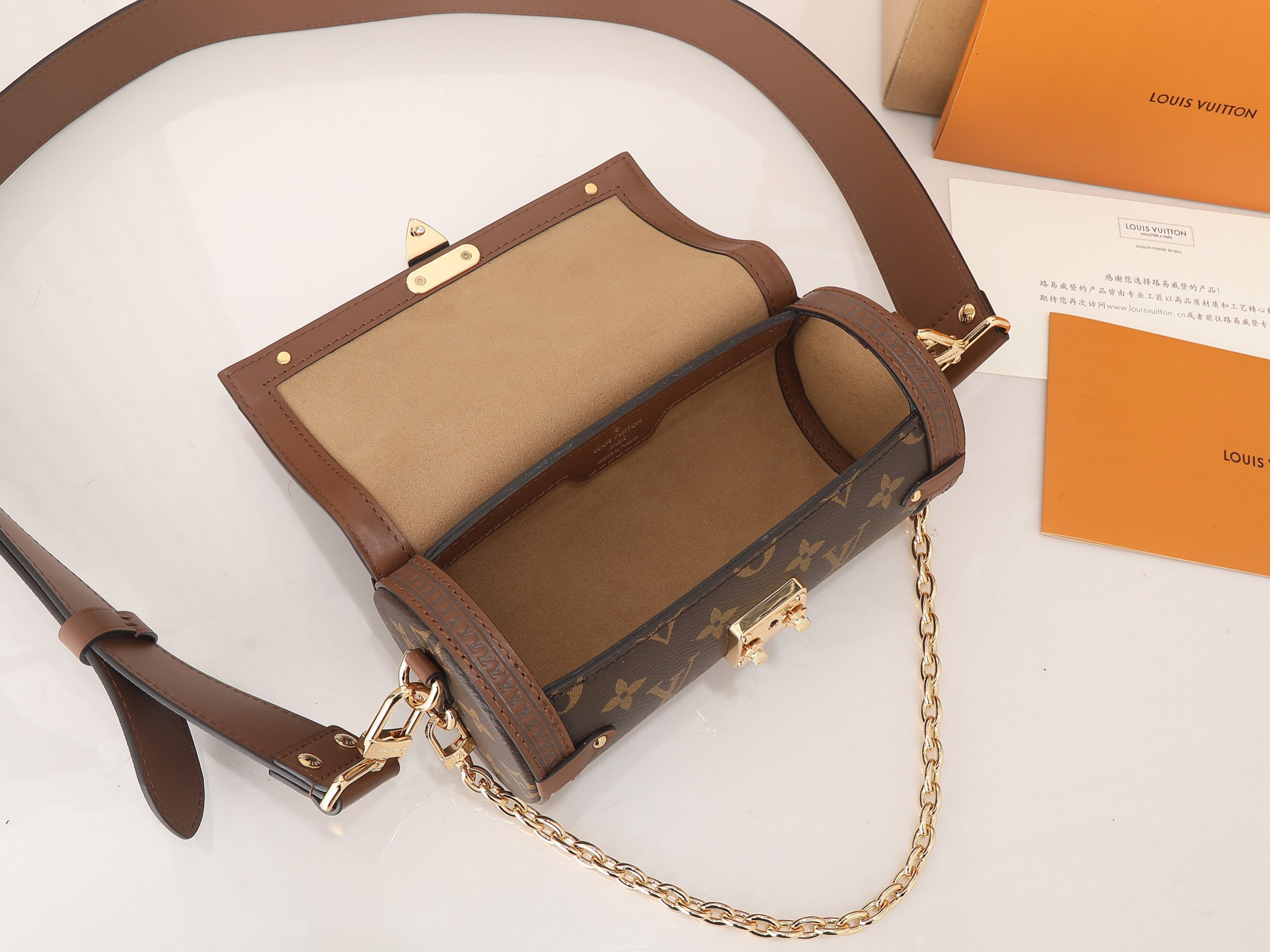 「Papillon Trunk」は1966年に誕生した伝統的なPapillonシリーズの現代版。19x9x9cmのコンパクトボディにモノグラムキャンバスと牛皮飾り縁を組み合わせ、30cm~52cmで調節可能なレザーショルダーストラップを装備。S-lockロックデザインが施された開口部にはマイクロファイバーライニングを採用し、iPhone15Pro(6.1インインチ)とリップクリームなどの日常小物を整理収納可能。取り外し可能なチェーンストラップで、エレガントからカジュアルまで3WAYスタイルが楽しめるデザインです。