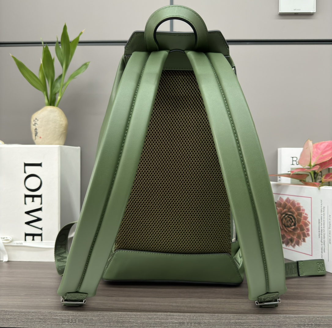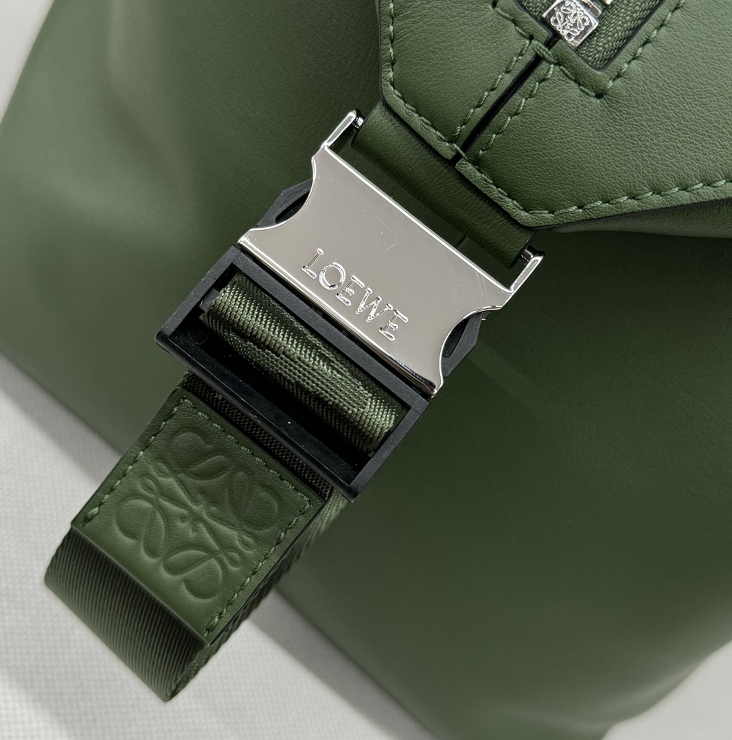 ブランドディテール:LOEWEのアイコニックなメタルバックルと牛革ジッパープルで高級感を演出。