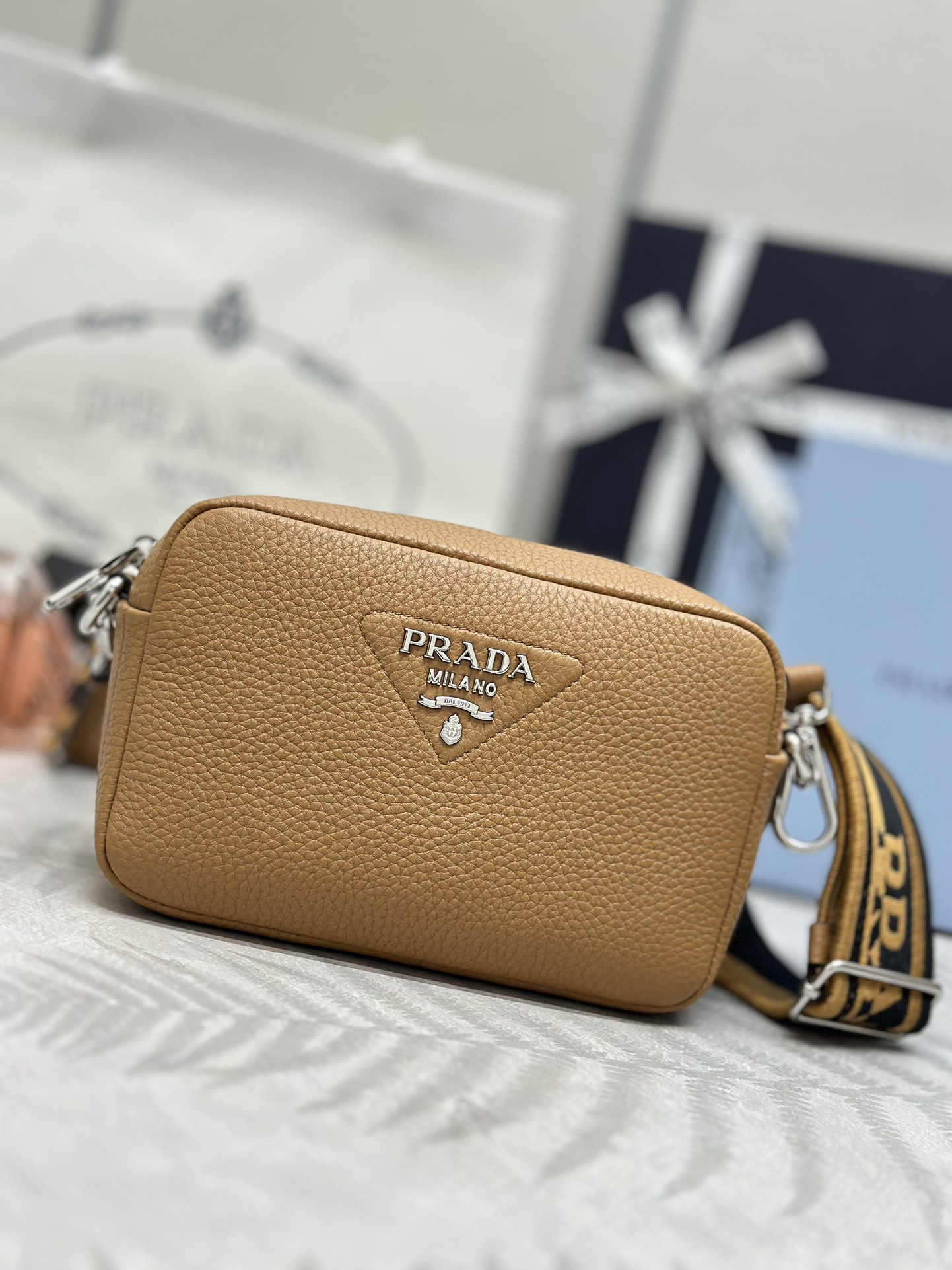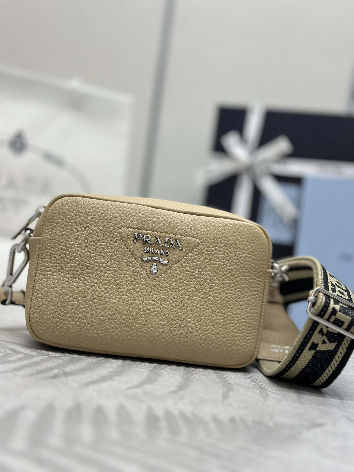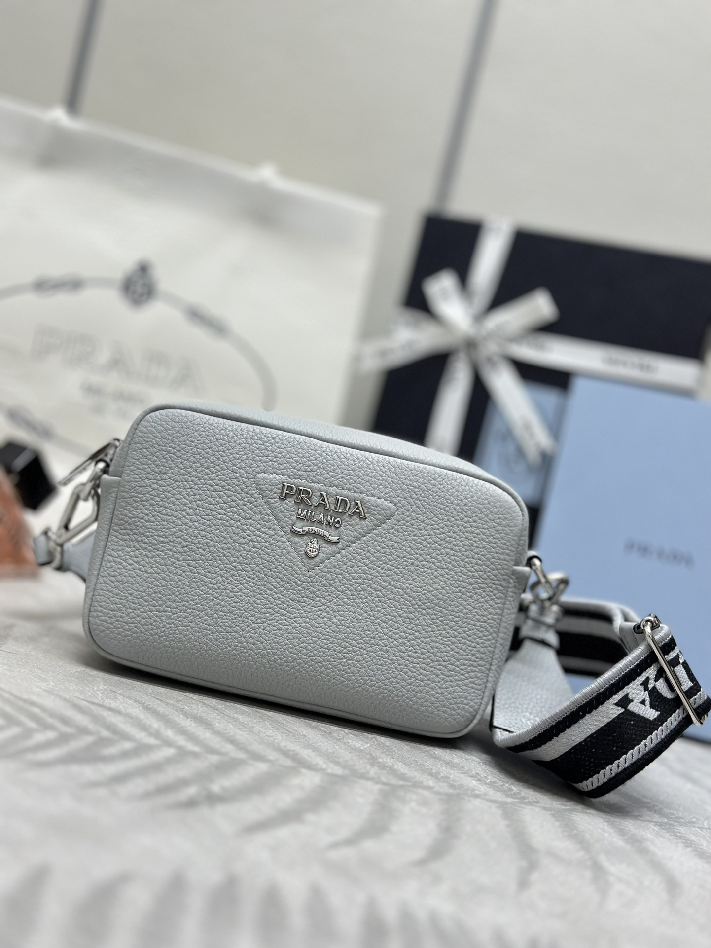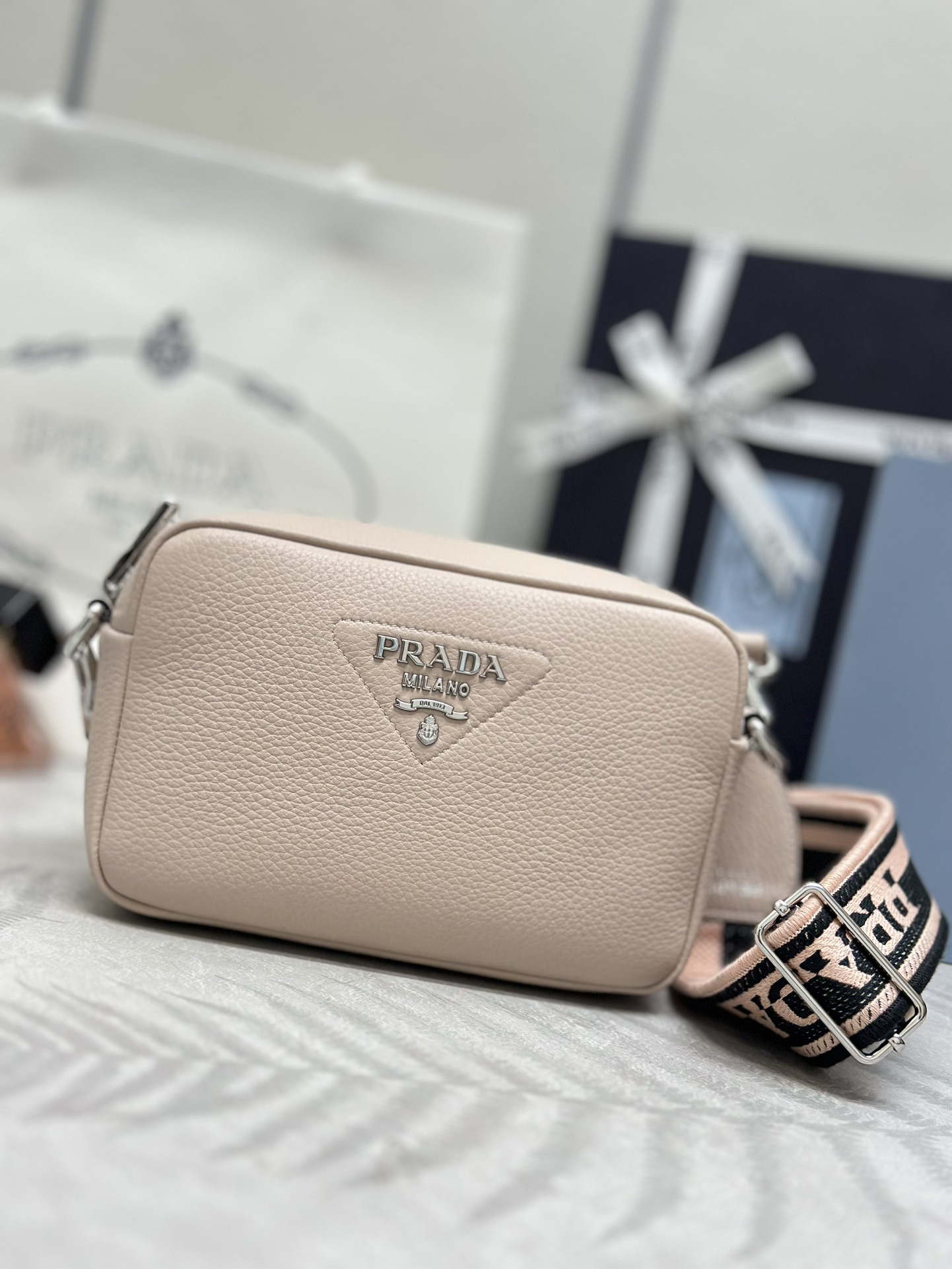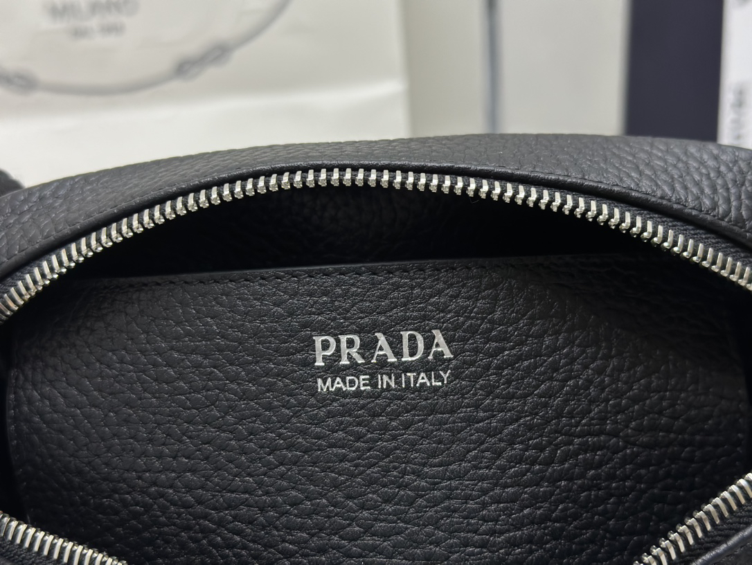 柔らかなシルエットの小型のレザー ショルダーバッグ。プラダを象徴するトライアングルの中に、光沢仕上げのメタルのレタリングロゴをエレガントにアレンジ。ロゴ刺繍入りショルダーストラップがモダンな個性を添える、汎用性の高いデザイン。